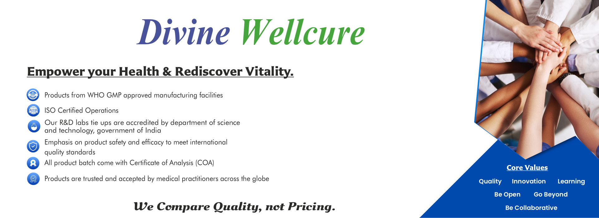 Quality is Non-Negotiable at Divine Wellcure Pvt. Ltd. We adhere to the highest industry standards to ensure that our Products not only meet but exceed your Expectations. We Deliver the Products Consistently in terms of Quality, Purity, Safety, and Efficacy to meet the expectations of the patients and regulators. Our commitment to quality extends from the initial concept to the final deliverable.